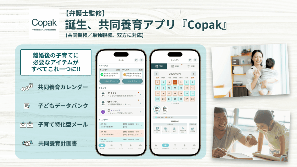 『Copak』は、離婚後の父母が子どもを中心に、穏やかで安定した共同子育てを行うためのアプリです。海外の共同親権制度の実務事例をもとに設計され、弁護士事務所の監修を受けて開発されています。