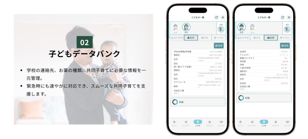 学校、医療、子育てに関する重要情報を父母間で一元管理。緊急時にも父母双方が迅速に対応できる仕組みを整え、子ども達にとっても安心で安全な養育環境を提供します。