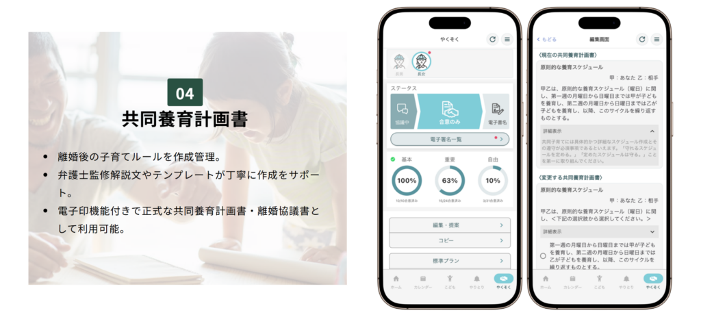 別居中・離婚前後の父母が対面することなくアプリ上で共同養育計画書を作成・合意可能。弁護士監修のテンプレートや解説文で専門知識を持たない方でも安心して使用できます。(電子署名機能付)(特許出願中)