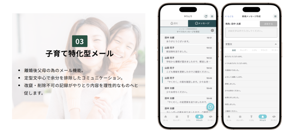 離婚後父母のための子育て専用コミュニケーション機能。定型文中心で離婚後父母間のやり取りを円滑化。余計なコミュニケーションを制限することで父母をストレスから守り、改ざん・削除不可のメール機能は父母間の感情的対立を抑制して理性的なやり取りを促進します。