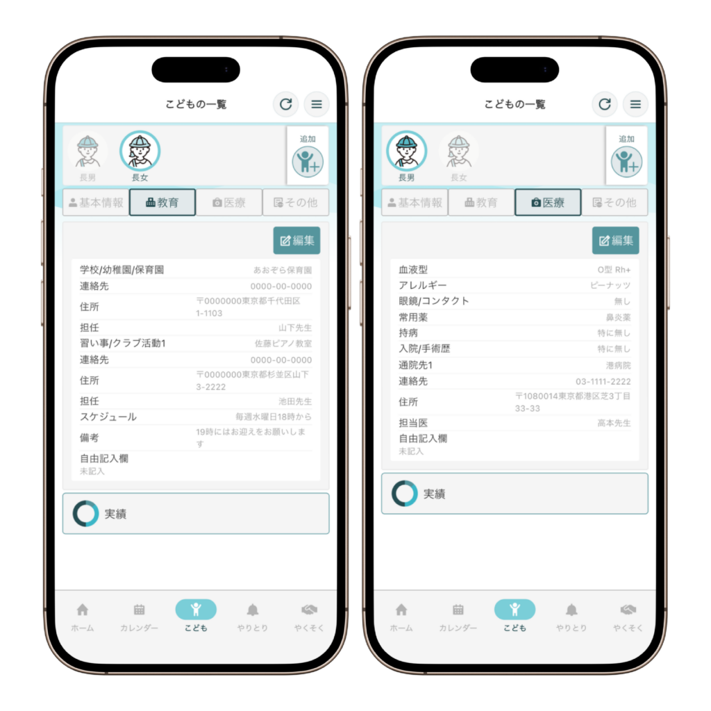 - 学校の連絡先、お薬の種類、共同子育てに必要な情報を一元管理。